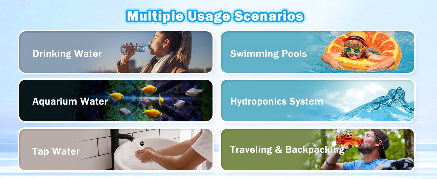 Suitable for drinking water, swimming pool, aquarium, aquaculture, laboratory and traveling scenarios!